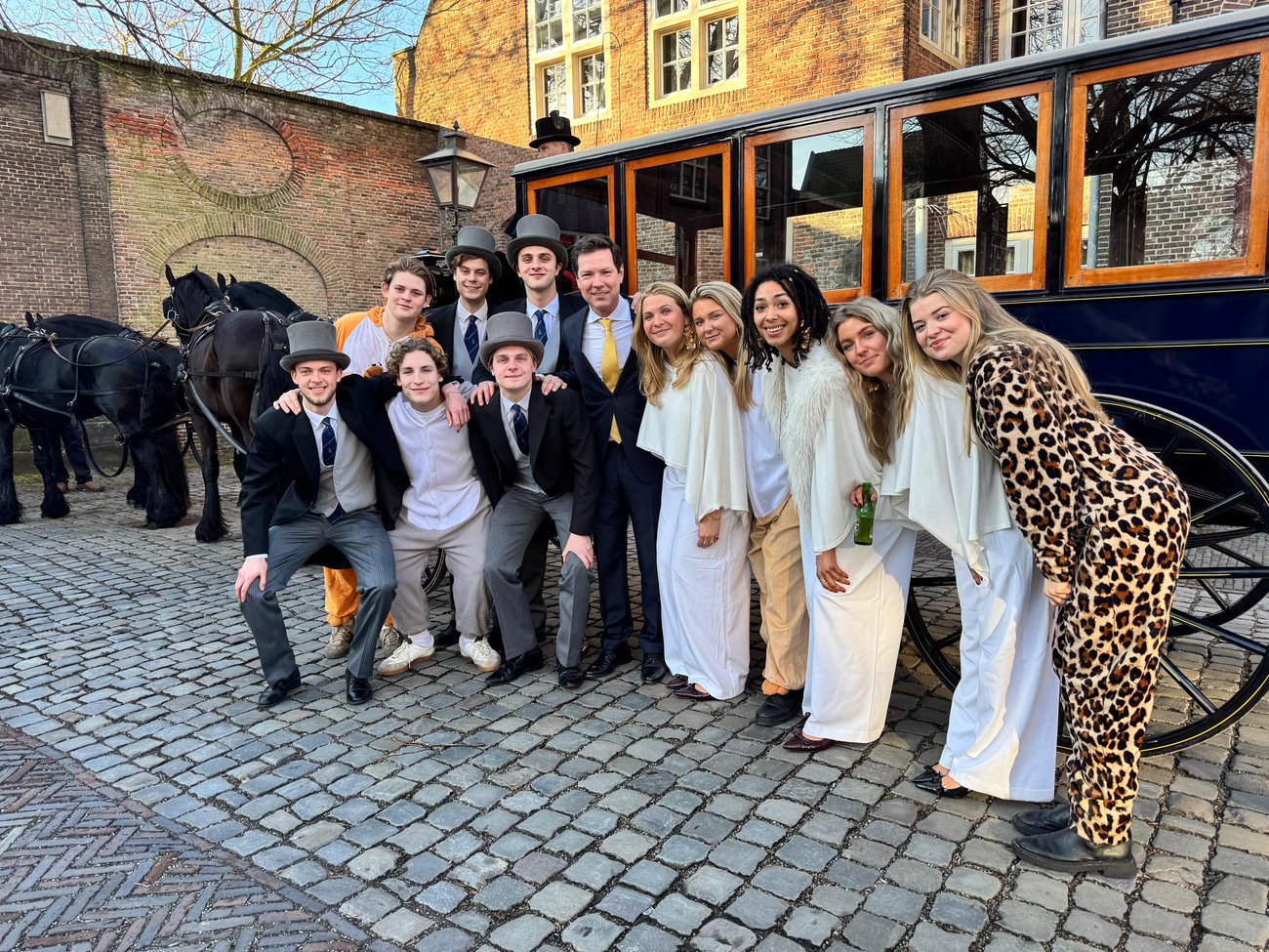 Een enthousiaste groep studenten van de Leidse Studenten Vereniging Minerva kwam een aantal weken geleden per koets langs met de nieuwste studentenalmanak.
