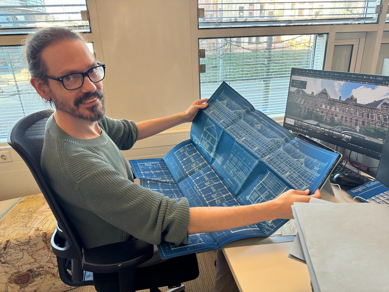 In de studiezaal van Erfgoed Leiden is het zelden stil. Maar op rustige momenten, wanneer er even geen bezoekers aan de balie staan, werkt studiezaalmedewerker Joris aan een bijzonder project: het actueel houden van oude bouwdossiers.