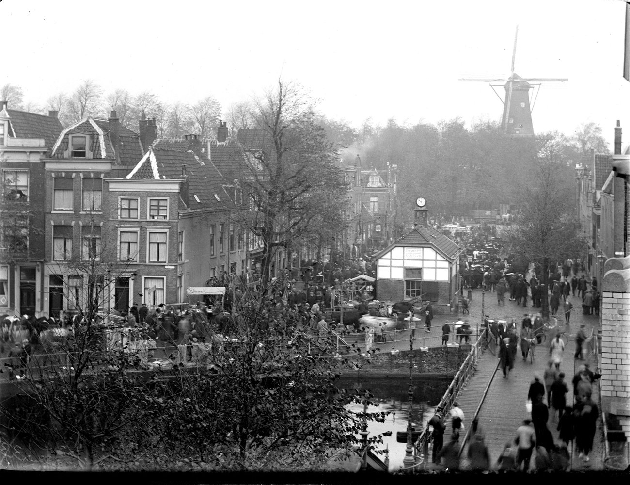 Gezicht op de Nieuwe Beestenmarkt en Molen De Valk tijdens de veemarkt. Foto door Johannes Wilhelmus Adrianus van der Zon, 1923. |