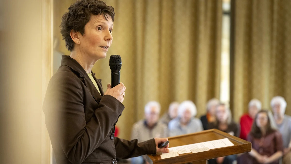 Foto: Susan Suèr van Erfgoed Leiden en Omstreken vertelt enthousiast over Maria van Nispen, de cipierster van het Gravensteen. © Foto Taco van der Eb |