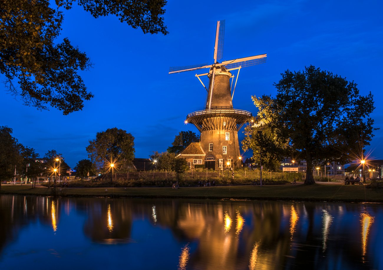 Beklim de molen en bewonder het uitzicht over Leiden bij nacht.